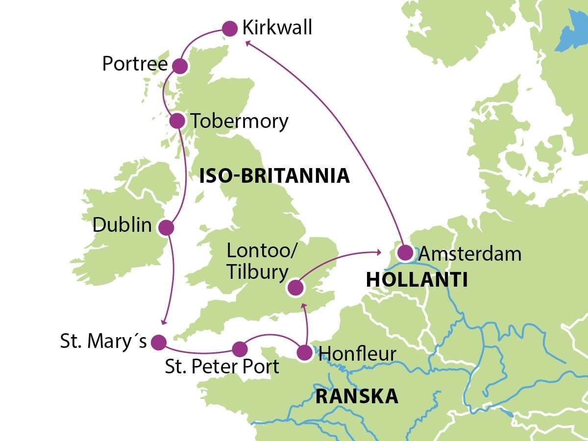 Suuntaa Britteinsaarten syrjäisille, luonnonkauniille pikkusaarille ja letkeän elämänmenon Irlantiin. Hemmottele itseäsi hienoilla maisemilla, charmikkailla kaupungeilla sekä risteilylaivalla lomailemisen vaivattomuudella ja ihanuudella. Ensin matkataan hilpeään Amsterdamiin, jossa ilahduttavat kanaalit ja vanha arkkitehtuuri. Invergordonissa on aistittavissa Skotlannin Ylämaiden vaikuttavat piirteet, jotka monesti kätkeytyvät osittain salaperäiseen sumuun. Mystisiä ovat myös seudun omaleimaiset nähtävyydet – myyttisen Loch Nessin kotijärvi ja vanhat, kolkonkomeat linnat. Skyen ja Mullin saarten kauneus kumpuaa kukkuloista, mahtavista vuorista ja rantajyrkänteistä, nummista ja hiekkarannoista.  Dublinissa on rento tunnelma ja paljon kiintoisaa katseltavaa. Cobhin pieni, melankolista menneisyyttä huokuva satamakaupunki näyttää nykyään ilopilleriltä kaiken värisine taloineen. Risteilyn loppupuolella viivähdät vielä saarten rauhassa. Scillynsaarten hienouksia ovat valkoiset rantahietikot ja upea subtrooppinen puutarha. Guernseyn saarella on St. Peter Portin soma pikkukaupunki mukulakivikatuineen ja linnoineen. Hienon loppusilauksen risteilylle antaa Ranskan sievä Honfleur, jonka näkymistä ovat inspiroituneet monet tunnetut taidemaalarit ja kirjailijat.