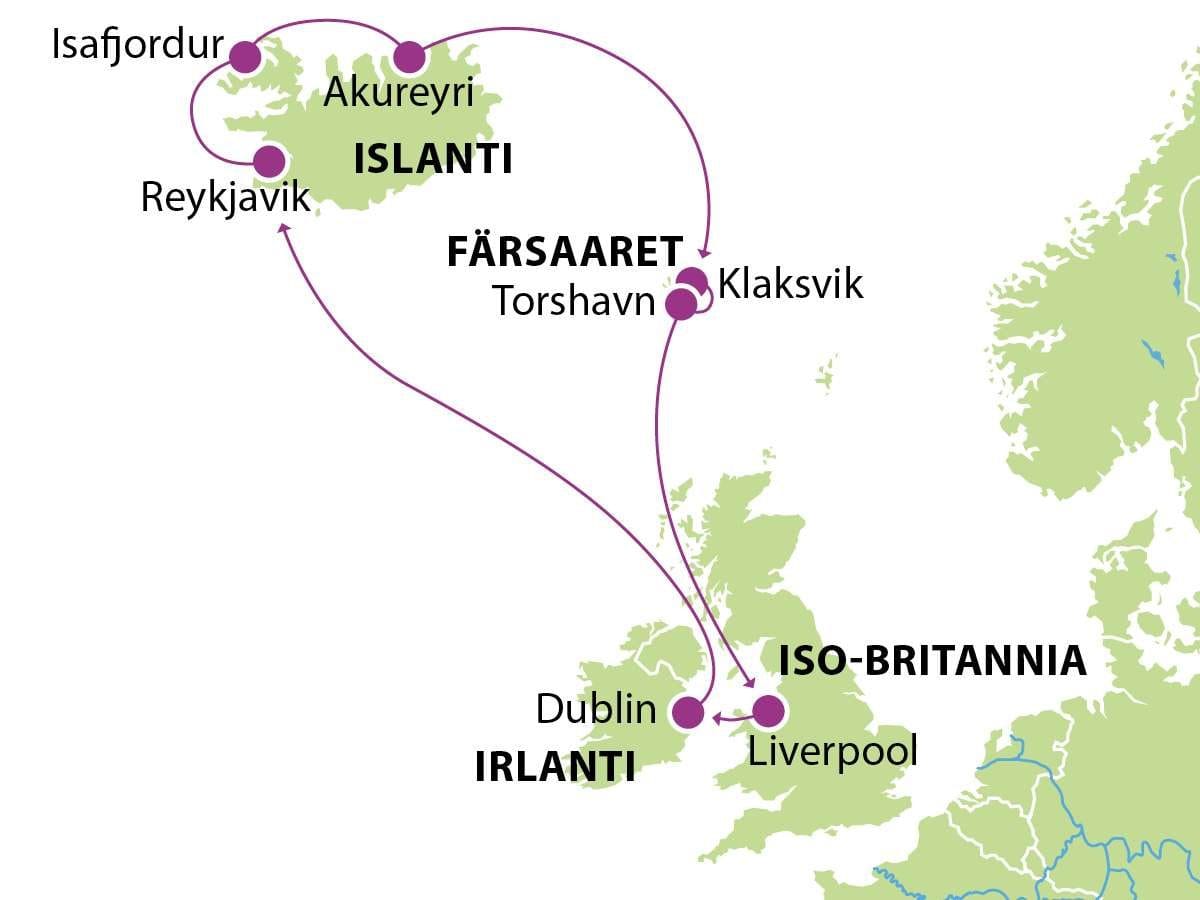 Ihastu pohjoisen eksotiikkaan! Näe Islannin parhaat palat ja turmeltumattomat Färsaaret. Risteilyä sävyttävät erikoiset luonnonihmeet, huikeat maisemat ja syrjäisten seutujen salaperäisyys. Meripäivien aikana on aikaa nauttia laivan ohjelmasta, mukavuuksista ja rauhaisasta ilmapiiristä; tämä risteily on suunnattu vain aikuisille. Matkan päätähti Islanti on omaperäisine nähtävyyksineen aivan omaa luokkaansa. Reykjavíkin ulkopuolella odottavat geysirit, jäätiköt ja vesiputoukset. Eristäytyneillä ja rauhaisilla Länsivuonoilla kohoilee vuonojen pirstoma, karunkaunis vuoristo. Akureyrin ympäristöstä löydät höyryäviä tasankoja, kummallisia laavamuodostelmia ja tulikuumina kuplivia mutalähteitä. Färsaarilla mykistää avaruus ja rauha. Kaikkialla on merestä nousevia, ruohon peittämiä vuorenrinteitä, joita koristavat vesiputoukset ja laiduntavat lampaat. Kylät ovat väripilkkuja. Risteilyä höystävät lähtö- ja paluusatamana toimiva Liverpool sekä Dublin – kiertele historiallisia nähtävyyksiä, piipahda pubiin ja nauti leppoisasta tunnelmasta.