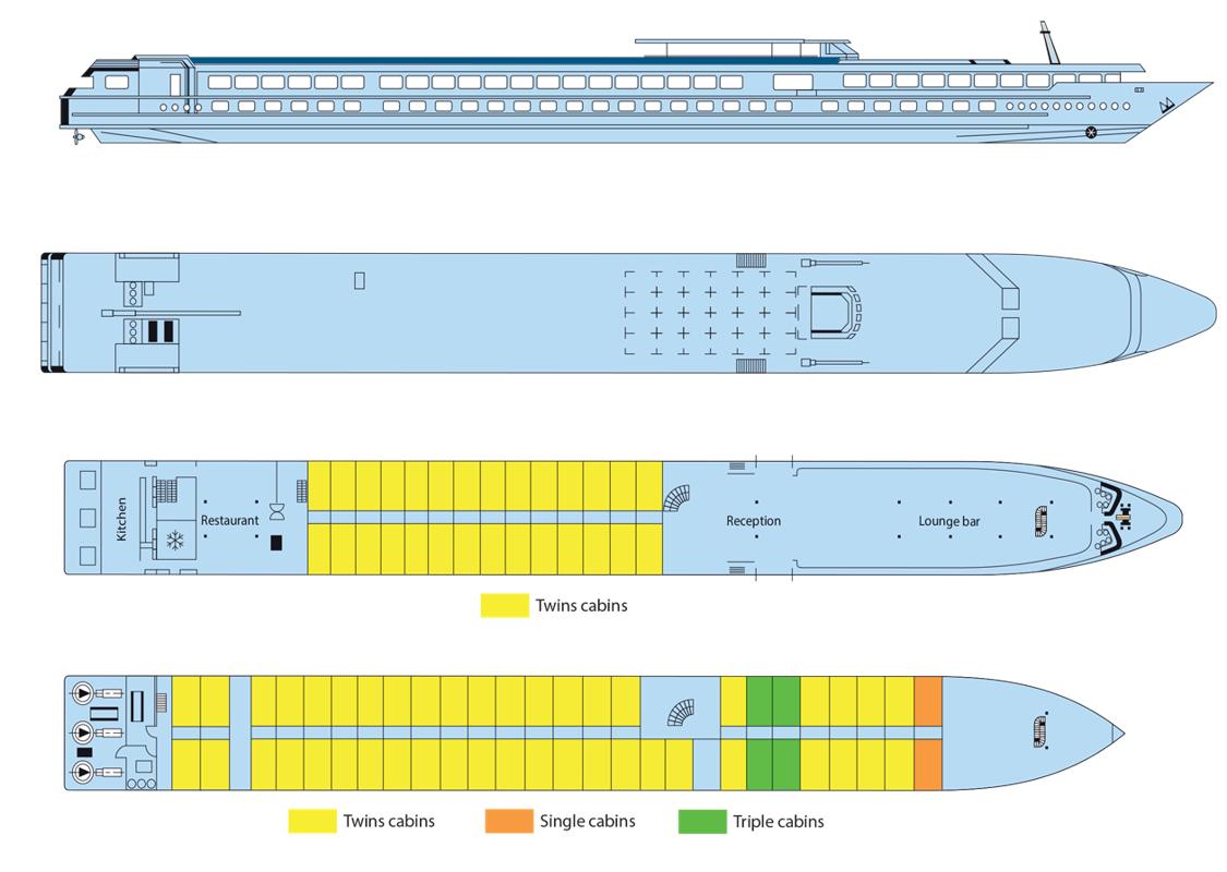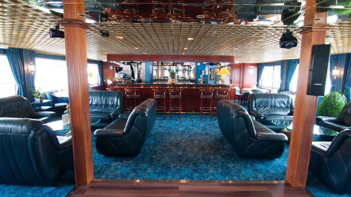 Laivalla on kaksi pääkantta ja tilava aurinkokansi. Ylemmällä kannella sijaitsevat Lounge-bar keulassa sekä peräosan ravintolasali. Laivan vastaanotto on myös samalla kannella. Ylemmällä kannella sijaitsevat sekä Lounge-bar keulassa sekä ravintolasali perässä. Samalla kannella sijaitsee myös vastaanotto. Laivalla on langaton internetyhteys.