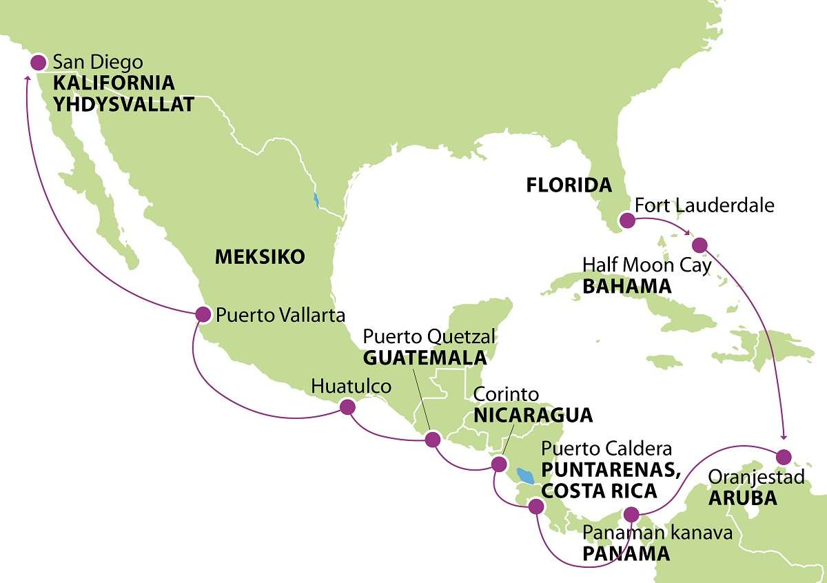 Lähtösatamana on Floridan suosittu rantalomakohde Fort Lauderdale. Bahamalla vietät päivän paratiisissa – lumoavalla yksityissaarella on upeat puitteet pitkine rantoineen. Aruban saaren ilahduttavimpia näkyjä ovat pääkaupungin värikkäät hollantilaistyyliset rakennukset. Panaman kanavan kautta pääset Tyynellemerelle ja Costa Ricaan, jonka valttina on uhkea luonto. Päiväretken ulottuvilla on vesiputouksia ja suojelualueita sademetsineen. Nicaraguaa ja Guatemalaa leimaavat tulivuorten hallitsemat maisemat ja hyvin säilyneet siirtomaa-ajan kaupungit. Risteilyn lopulla saat lekotella Meksikon lomaidylleissä; Huatulcon ihanilla rannoilla ja viehättävässä Puerto Vallartassa, jonka vanhakaupunki huokuu aidon leppoisaa meksikolaistunnelmaa. Huikea matka päättyy Kaliforniaan, San Diegon sporttiseen miljoonakaupunkiin.