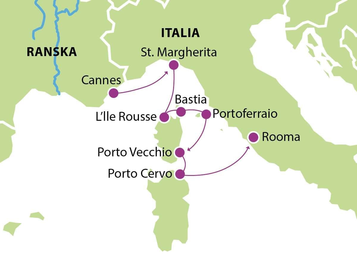 Cannes (Ranska) – St. Margherita (Italia) – L’lle Rousse (Korsika, Ranska) – Bastia (Korsika, Ranska) – Portoferraio (Elba, Italia) – Porto Vecchio (Korsika, Ranska) – Porto Cervo (Sardinia, Italia) – Rooma (Italia)