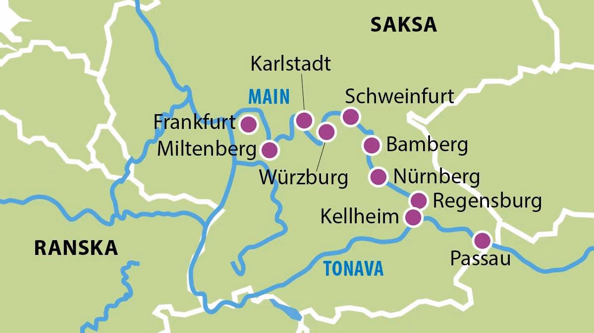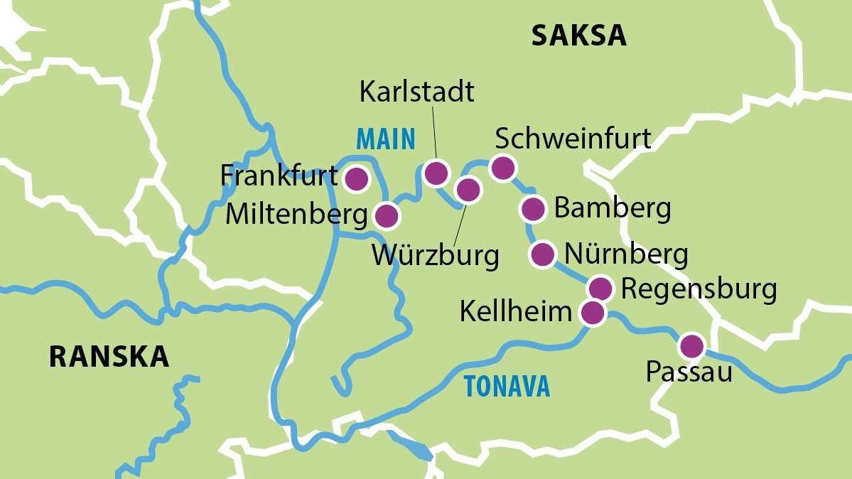 Keväisellä Saksan risteilyllä koet maan romanttisimmat seudut ja ihastuttavat kaupungit, jotka kuiskivat menneistä ajoista. Laskeudu risteilylomailun huolettomaan, nautinnolliseen tahtiin. Astut laivaan dynaamisessa Frankfurtissa – kaupunkisiluettia hallitsevat pilvenpiirtäjät, mutta niiden alta löytyy myös perinteikäs kaupunki. Matkaat ”Mainin helmeksi” kutsuttuun viehättävien puuristikkotalojen Miltenbergiin ja viimeistään Würzburgissa on syytä istahtaa viinitupaan maistelemaan seudun satoa. Alueella saattaa tuntua, että aika on pysähtynyt keskiajalle. Bambergin jälkeen alkaa Main-Tonava-kanavan 171 km pitkä osuus. Nürnbergin houkutuksia ovat somat puuristikkotalot, vanha linna ja paikkakunnan herkulliset piparkakut. Matkan päättää pittoreski Regensburg, joka on oiva päätössatama risteilylle.
