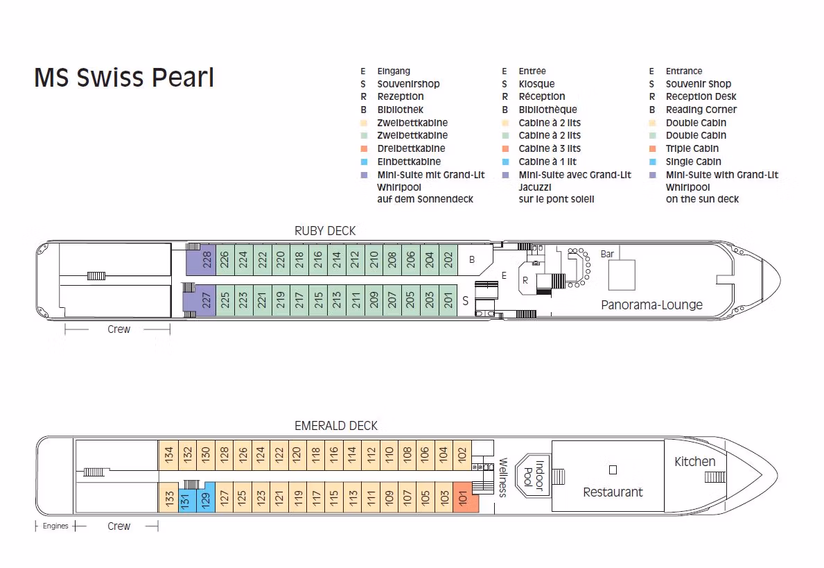 Elegantti mutta kodikas m/s Swiss Pearl on rakennettu vuonna 1993 ja uudistettu vuosina 2006 sekä 2012. Laivalla on 32 hengen miehistö, jotka pitävät hyvää huolta reilusta sadasta matkustajasta. Tyylikkäästi sisustetut tilavat yleiset tilat sekä mukavat hytit takaavat risteilymukavuuden koko matkan ajan yhdessä ystävällisen miehistön kanssa.
