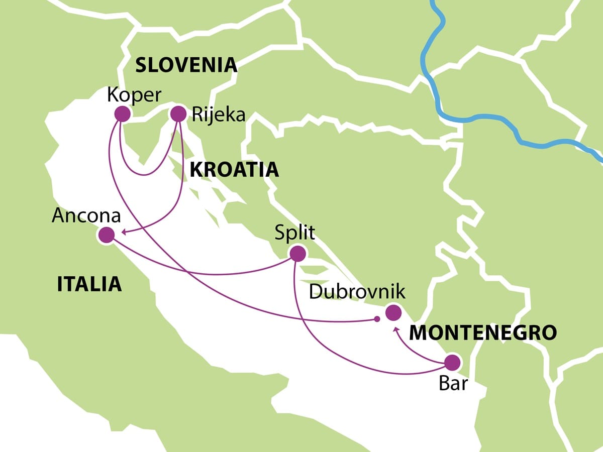 Dubrovnik (Kroatia) Koper (Slovenia) Rijeka (Kroatia) Ancona (Italia) Split (Kroatia) Bar (Montenegro) Dubrovnik (Kroatia)